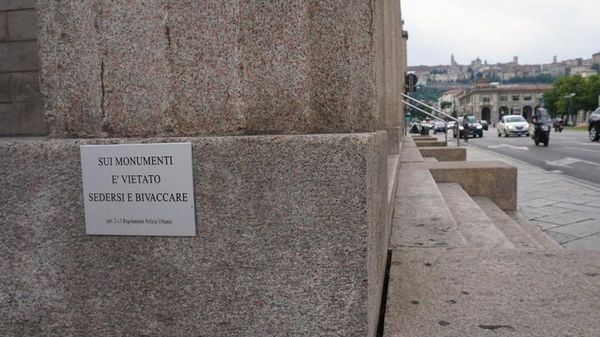 «Sui monumenti è vietato sedersi e bivaccare»: sono comparsi i cartelli ai Propilei contro i bivacchi.