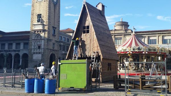 In piazza Vittorio Veneto, sta arrivando a tradizionale Capanna di Natale de «L'Eco di Bergamo» con il salvadanaio per la raccolta di offerte «Per i bambini più soli».