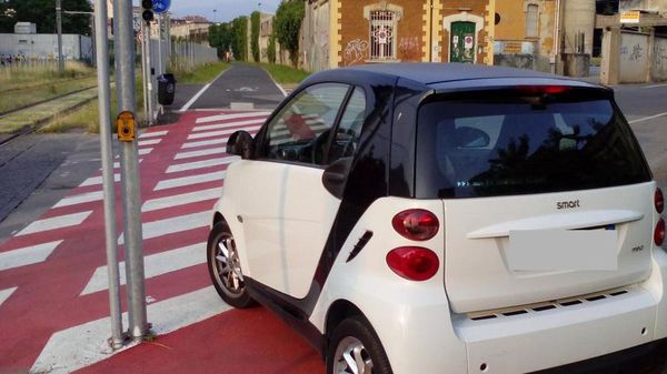 Ok, è piccolina e non ingombra molto, e inoltre è bianconera, e si sa che di questi tempi sono colori che comandano..., però fa comunque un certo effetto vedere un’auto, una Smart, parcheggiata in modo così sfacciato. E dire che le sue dimensioni ridotte dovrebbe consentire a chi la guida un parcheggio più sensato.