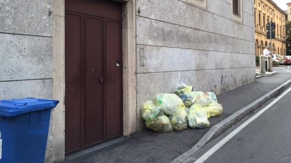 La protesta di un lettore da via Mario Bianco: vicino a un ingresso secondario degli Uffici della Provincia i sacchi dei rifiuti posizionati per la raccolta «occupano» l’intera larghezza del marciapiede.