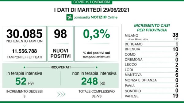 È quanto si legge nel monitoraggio Ats relativo alla settimana 23-29 giugno. «I dati confermano e rinforzano la decrescita della curva epidemica».