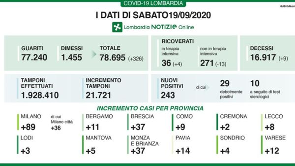A Bergamo i casi sabato 19 settembre sono aumentati di 11 unità.