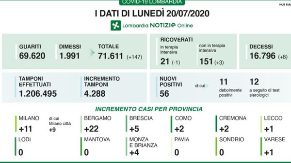 Coronavirus, i dati di lunedì 20 luglio. Otto i decessi sul territorio Lombardo dopo lo «zero» registrato ieri. Quattro province a quota zero.