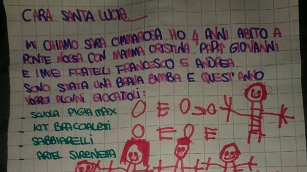 «Cara Santa Lucia, mi chiamo Sara Cimmarosa e ho 4 anni. Vivo a Ponte Nossa con la mamma Cristina, papà Giovanni e i miei fratelli Francesco e Andrea. Quest’anno sono stata una brava bimba e vorrei alcuni giocattoli».