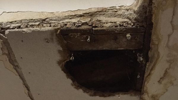 Un pannello del soffitto dell’istituto scolastico si è staccato nel corridoio dell’ultimo piano che permette l’accesso alle classi. Il foro nel tetto è tuttora presente e cadono continui detriti.