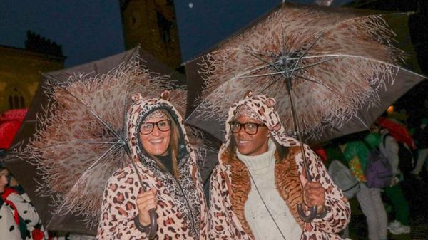 Nonostante la pioggia e il freddo in centinaia al pigiama party. Pigiami colorati e stravaganti in Piazza Vecchia e ombrelli variopinti . Mika in Città Alta: il maxi letto dove andrà in scena il video montato sotto i portici del Palazzo della Ragione.