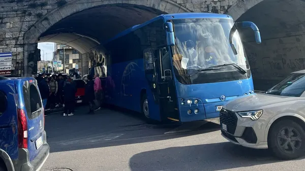 VIABILITÀ. Verso le 16 di lunedì 10 marzo un’auto e un bus si sono incastrati sotto il ponte della ferrovia. Traffico difficoltoso nella zona della Malpensata a Bergamo.