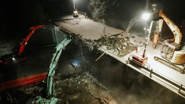 VAL SERIANA. È iniziata verso le 22,30 di sabato 17 febbraio la demolizione del cavalcavia urtato e danneggiato due volte da mezzi pesanti. Sarà ricostruito. Chiuso fino alle 6 di domenica 18 febbraio un tratto della statale 671.