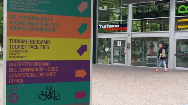 Sul cartello turistico vicino all’Urban Center fa bella (!?) mostra di sé un emblematico cartello che indica «l’areoporto» di Orio al Serio. Tra le poche indicazioni presenti in zona per i turisti, letteralmente abbandonati a se stessi.