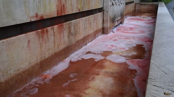 Acqua rossa nel monumento di viale Vittorio Emanuele che ricorda il pilota bergamasco