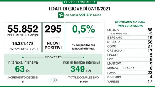 I dati Covid diffusi domenica 24 ottobre: in Lombardia 4 decessi e 393 nuovi contagiati. Ricoveri stabili, a Milano 106 nuovi positivi, sono 42 a Bergamo e Brescia.