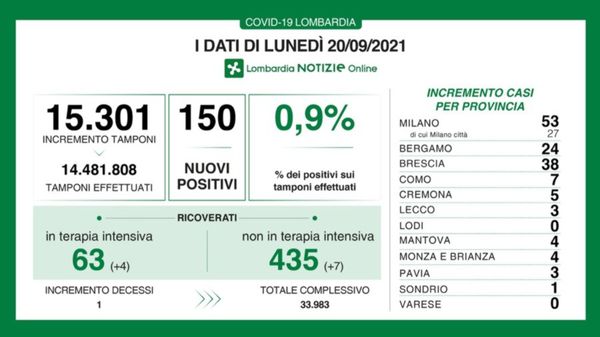 Sono 304 i nuovi positivi al coronavirus in Lombardia, nelle ultime 24 ore. I dati sono stati diffusi dal Ministero della Salute domenica 26 settembre, sabato i positivi erano 478.