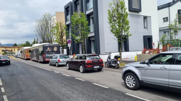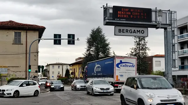 LO SNODO. Posizionate le attrezzature: file da e per Bergamo lungo via Ruggeri da Stabello.