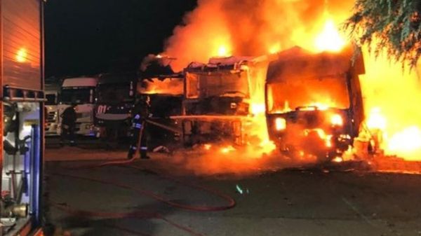 Un uomo sarebbe stato ripreso dalle telecamere scavalcare e dare fuoco a un camion, le fiamme si sono poi propagate agli altri mezzi di una ditta di Brivio al confine con Cisano Bergamasco.