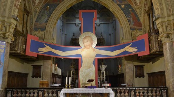 L’installazione dell’enorme Cristo crocifisso campeggia nella parrocchiale di Fiorano: è stata realizzata da alcuni papà della comunità e dipinta dalla decoratrice Mariella Pilatti.
