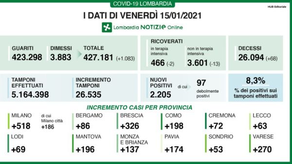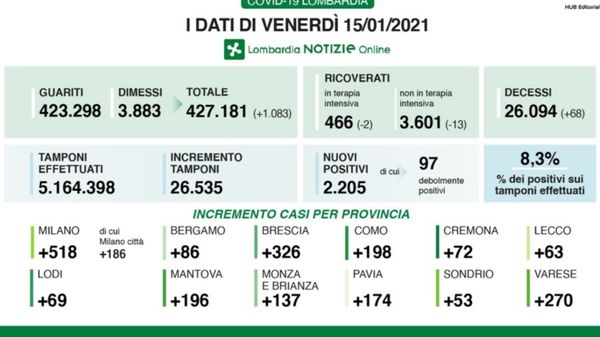 A fronte di 26.535 tamponi effettuati, sono 2.205 i nuovi positivi al coronavirus venerdì 15 gennioa in Lombardia, dove i decessi sono 68 per un totale complessivo di 26.094 da inizio pandemia.