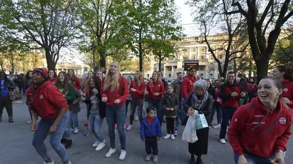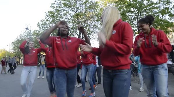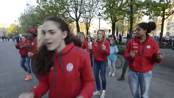 Flash mob delle giocatrici della Foppapedretti mercoledì 8 aprile alle 19 sul Sentierone. Sulle note di «I’m an Albatraoz» dello svedese AronChupa le atlete rossoblù, in tuta, si sono messe a ballare per strada...