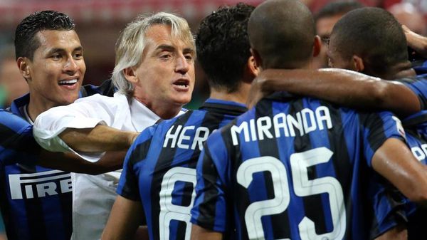 Mancini festeggia il primo successo stagionale della sua Inter. Sorride e gioisce senza freni al 93’, quando Jovetic trova un colpo da campione con uno splendido destro a giro.