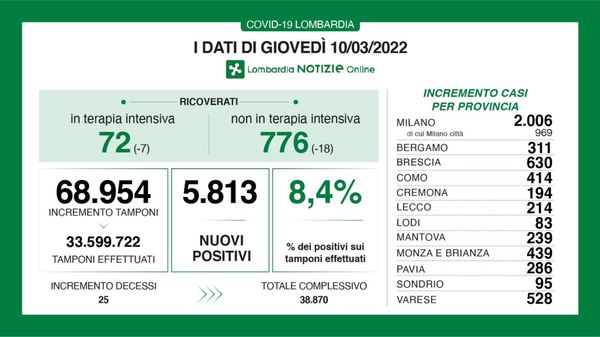 I dati Ecco il consueto report di Regione Lombardia sull’andamento della pandemia: le persone ricoverate con sintomi sono 776, di cui 72 in terapia intensiva.