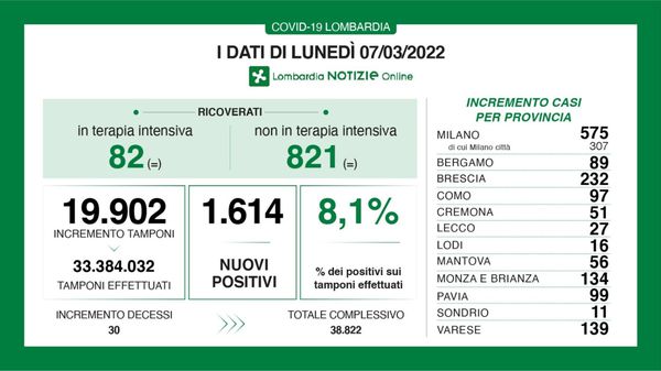 I dati Con 19.902 tamponi, sono 1.614 i nuovi casi positivi in Lombardia con il tasso di positività in calo all’8,1% (8,4%). Sono stabili i ricoveri in terapia intensiva (82) così come nei reparti ordinari (821). I decessi sono 30 per un totale complessivo di 38.822 morti in regione dall’inizio della pandemia.