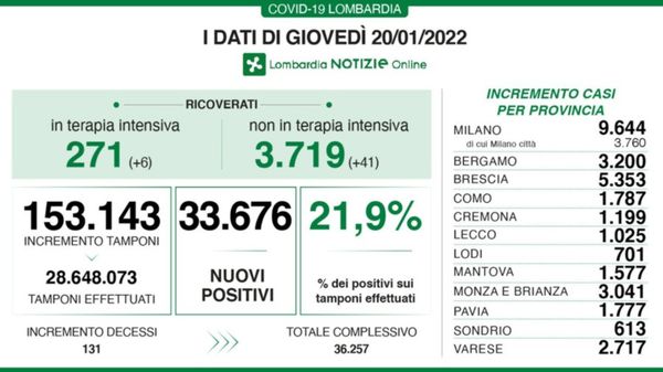 A fronte di 153.143 tamponi effettuati, sono 33.676 i nuovi positivi (21,9%).