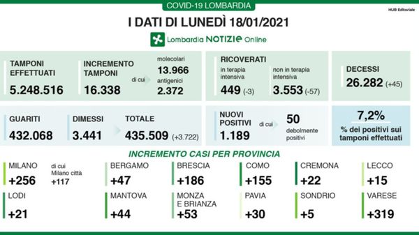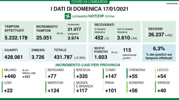 Ecco i dati dello sviluppo della pandemia in Lombardia aggiornati a domenica 17 gennaio.