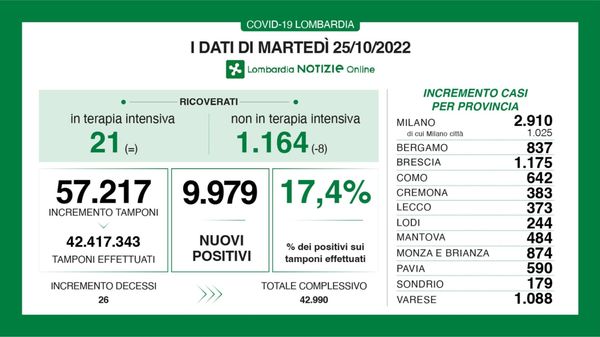 Sono 9.124 i nuovi casi di Covid in Lombardia, a fronte di 40.423 tamponi effettuati, di cui è risultato positivo il 22,5%. Cresce, quindi, il tasso di positività al 20,7% mercoledì, quando i contagiati lombardi erano 8.498 (su 41.013 tamponi).