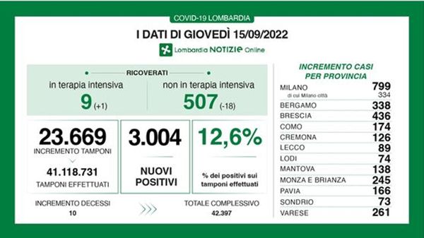 I dati. A fronte di 27.903 tamponi effettuati sono 3.525 i nuovi positivi al Covid, nelle ultime 24 ore in Lombardia, con un tasso di positività in discesa al 12,6% mercoledì 21 settembre (14,6% martedì).