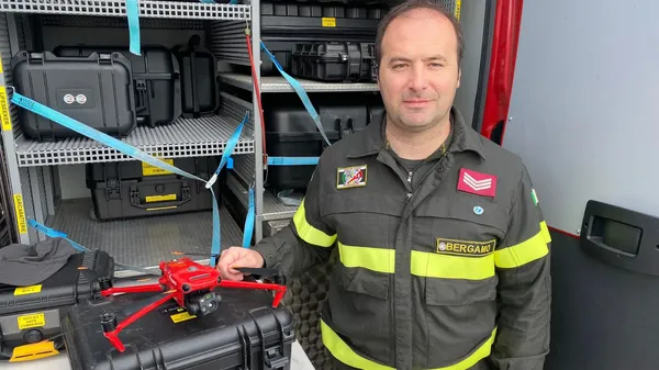 VIGILI DEL FUOCO E TECNOLOGIA. Il nuovo Nucleo sistema aeromobile pilotaggio remoto (Sapr) conta 16 specialisti, due a Dalmine. In un anno oltre 180 interventi: «È come pilotare un aereo e può simulare una cella per agganciare cellulari».