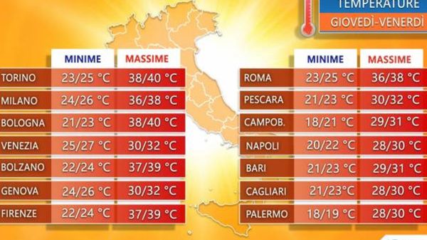 Per la prima volta nella storia meteorologica italiana potranno raggiungersi nel mese di giugno valori di 40°C. L’anticiclone tenderà gradualmente a smorzarsi a partire dal weekend, ma le temperature resteranno comunque elevate fino a metà della prossima settimana.