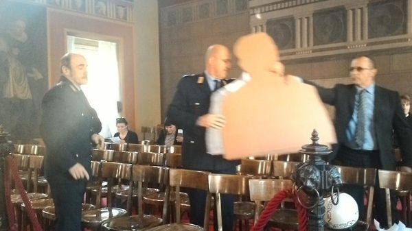 Irruzione in Consiglio comunale a Bergamo di alcuni attivisti appartenenti al gruppo «Aldo dice 26X1». I manifestanti hanno posizionato sulle sedie dell’aula consiliare tre sagome di cartone raffiguranti Benito Mussolini, Antonio Locatelli e Gennaro Sora.