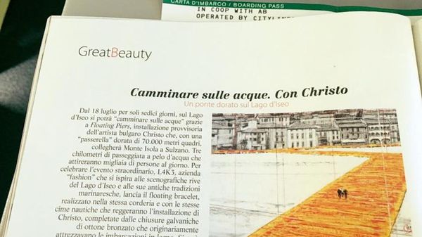 Sulla rivista di bordo di Alitalia viene promossa la camminata sul lago d’Iseo «The Floating Piers», un articolo che celebra la nuova opera di Christo e che promuove una visita in Bergamasca per una passeggiata sulla «passerella più chiacchierata» del momento.