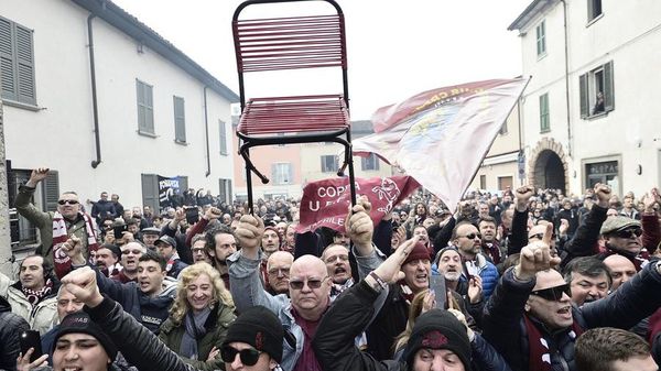 Folla a Rivolta d’Adda per i funerali di Emiliano Mondonico, alcuni con le sedie alzate. In chiesa i ricordi: i mercoledì sul campo dell’oratorio e le note di «Io vagabondo».