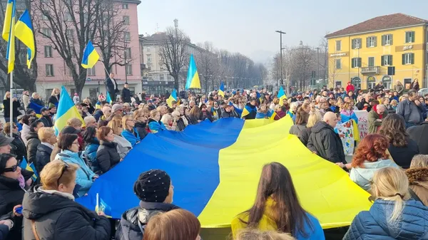 LA MANIFESTAZIONE. «La bandiera ucraina è su Palazzo Frizzoni e sventola ancora, come dimostrazione che il Comune di Bergamo non ha mai smesso di stare dalla parte degli aggrediti» dice la sindaca Elena Carnevali.