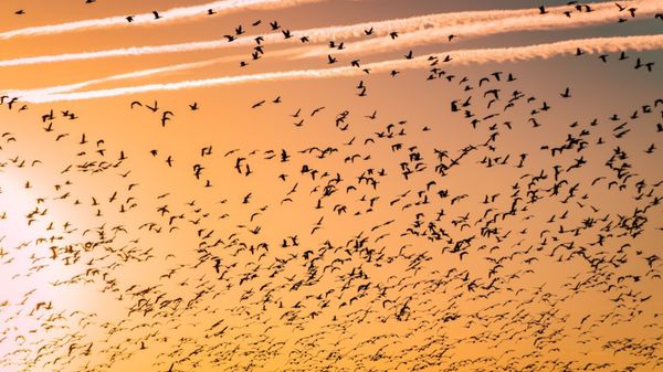 Un’affascinante e ipnotica danza di un gigantesco stormo lunedì mattina all’alba sopra la coda di auto in coda verso il rondò delle valli.