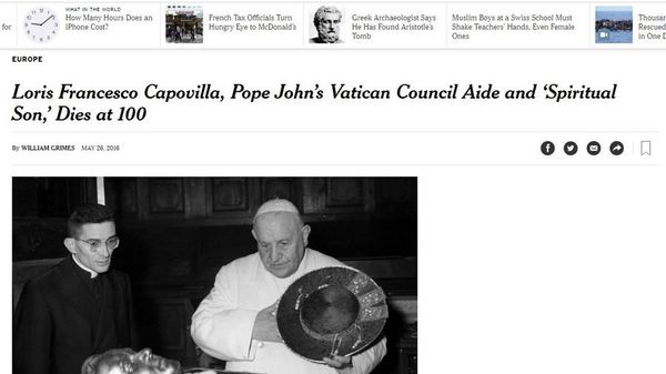 «In Capovilla, Roncalli ha trovato molto più che un segretario: un figlio spirituale, un esecutore letterario, un confidente». Sono le parole scelte dal New York Times per ricordare il cardinale Loris Capovilla, scomparso all’età di 100 anni.