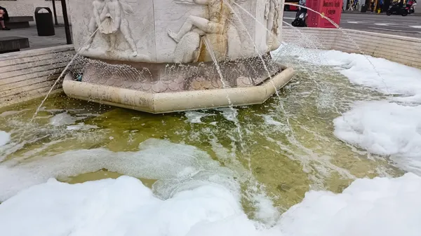BERGAMO. L’acqua della fontana ai Propilei di fronte alla sede dell’ex Credito Bergamasco verso le 19 di martedì 30 maggio si è riempita di schiuma.
