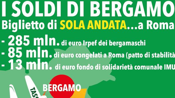 «I soldi di Bergamo, biglietto di sola andata a Roma». Recitano così i manifesti che da mercoledì saranno affissi in città dalla Lega Nord. «Si tratta di un modo per denunciare per l’ennessima volta il ladrocinio messo in atto da Roma ai danni dei Comuni del Nord».