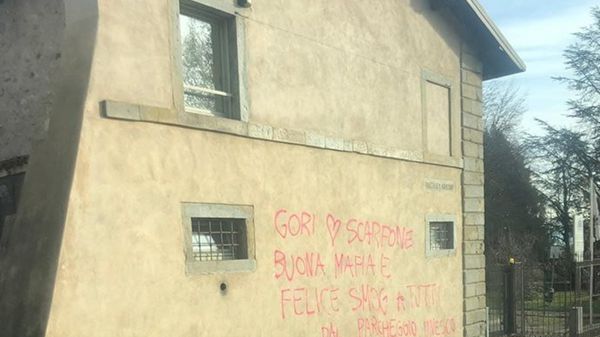 Scritte ingiuriose contro i lavori alla Fara sulla facciata dello storico edificio di Sant’Agostino, in Città Alta. Sono comparse il giorno Natale e ora coperte. Ma resta l’indignazione del Comune, che avvisa: «Il costo sarà a carico dei cittadini».