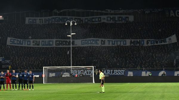 Un minuto di silenzio per Mino Favini e uno striscione per ricordarlo. Mino Favini è nei pensieri dei tifosi bergamaschi.