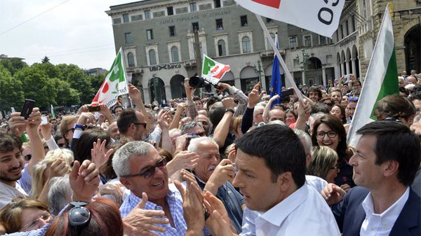 Un’insolito martedì in piazza Vittorio Veneto. Il premier lancia Gori verso Palafrizzoni e invita al cambiamento. Il sindaco lo attacca per la mancata visita: «Se ne sbatte dei problemi di Bergamo». E la Lega fa svolazzare l’aereo già riservato a Monti.
