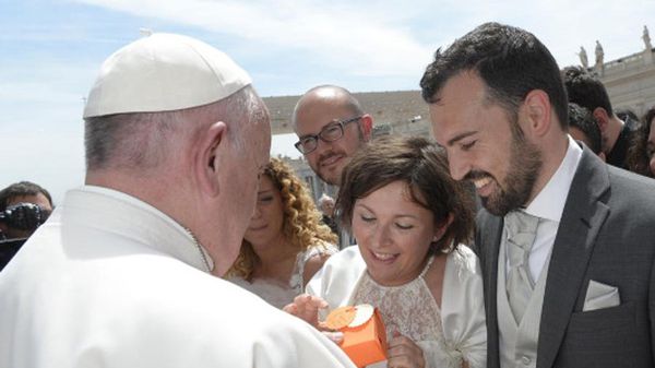 Abbiamo parlato col Papa! Erano circa le 13,30 all’udienza generale di settimana scorsa quando hanno chiesto a noi sposi novelli di spostarci nella zona centrale del sagrato, dietro a delle staccionate, per l’incontro con Francesco.
