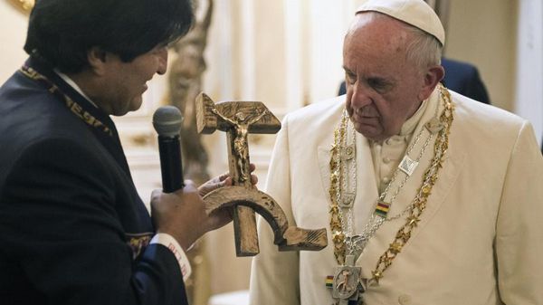 A caval donato non si guarda in bocca, ma l’espressione del Papa nel ricevere il crocifisso di Evo Morales ricavato dalla falce e martello era davvero curiosa. Qualcosa a mezza strada fra il perplesso e il condiscendente.