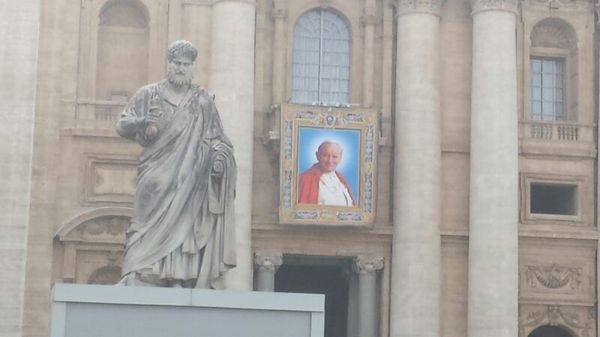 Nella giornata di venerdì 25 aprile sono già stati esposti i due arazzi raffiguranti i due pontefici che domenica saranno canonizzati: a sinistra, guardando la facciata di San Pietro, Papa Giovanni Paolo II, a destra Papa Roncalli.