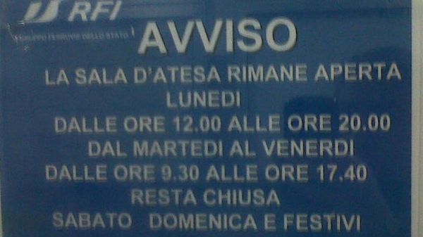 Più che gli orari di una sala d’attesa, potrebbero sembrare quelli di un ambulatorio o di qualche ufficio pubblico. Di certo è che il cartello riguardante la sala d’atesa (sì, con una sola T purtroppo) della stazione di Verdello-Dalmine è alquanto curioso. Lo segnala la lettrice Silvia C.