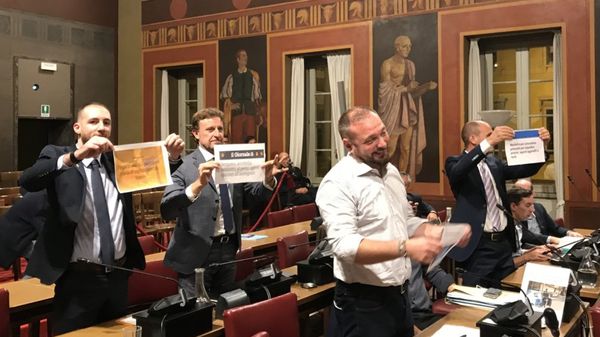 È terminata in protesta - con la Lega a sollevare cartelli in aula - la lunga sessione del Consiglio comunale di lunedì sera.