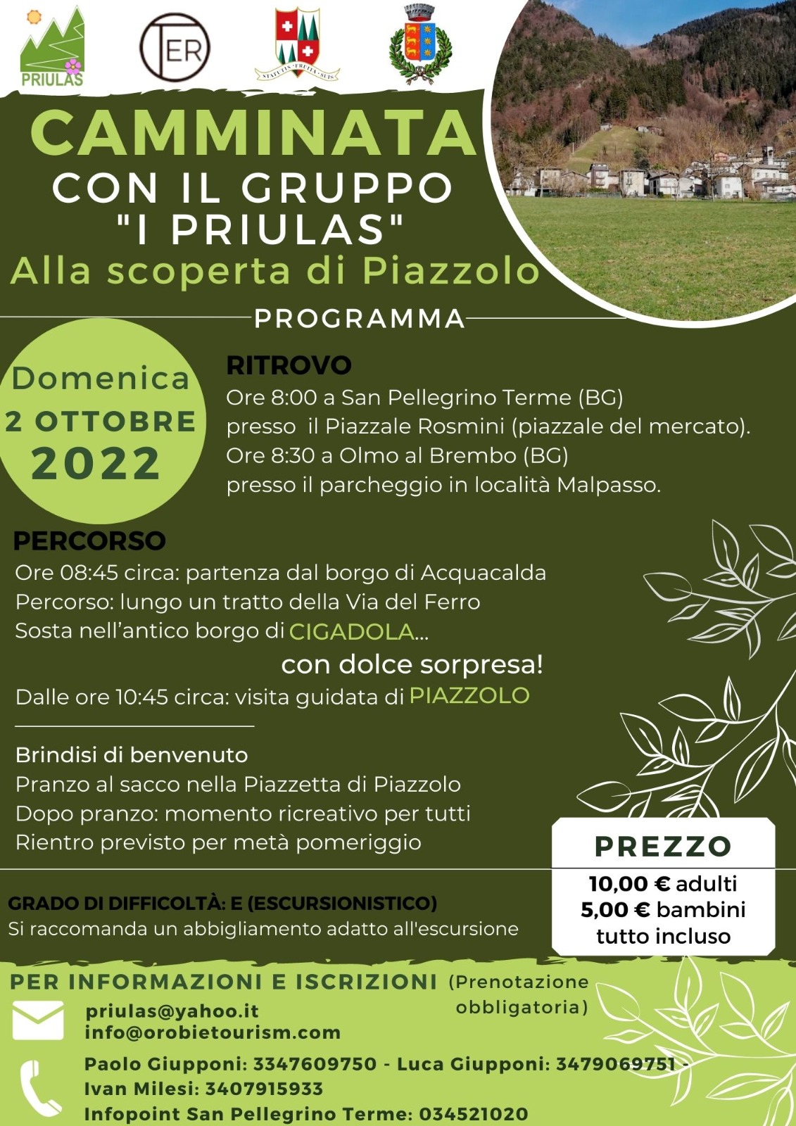 Ritrovo alle 8 a San Pellegrino Terme (Piazzale Rosimni) o alle 8.30 a Olmo al Brembo (Paarcheggio località Malpasso).