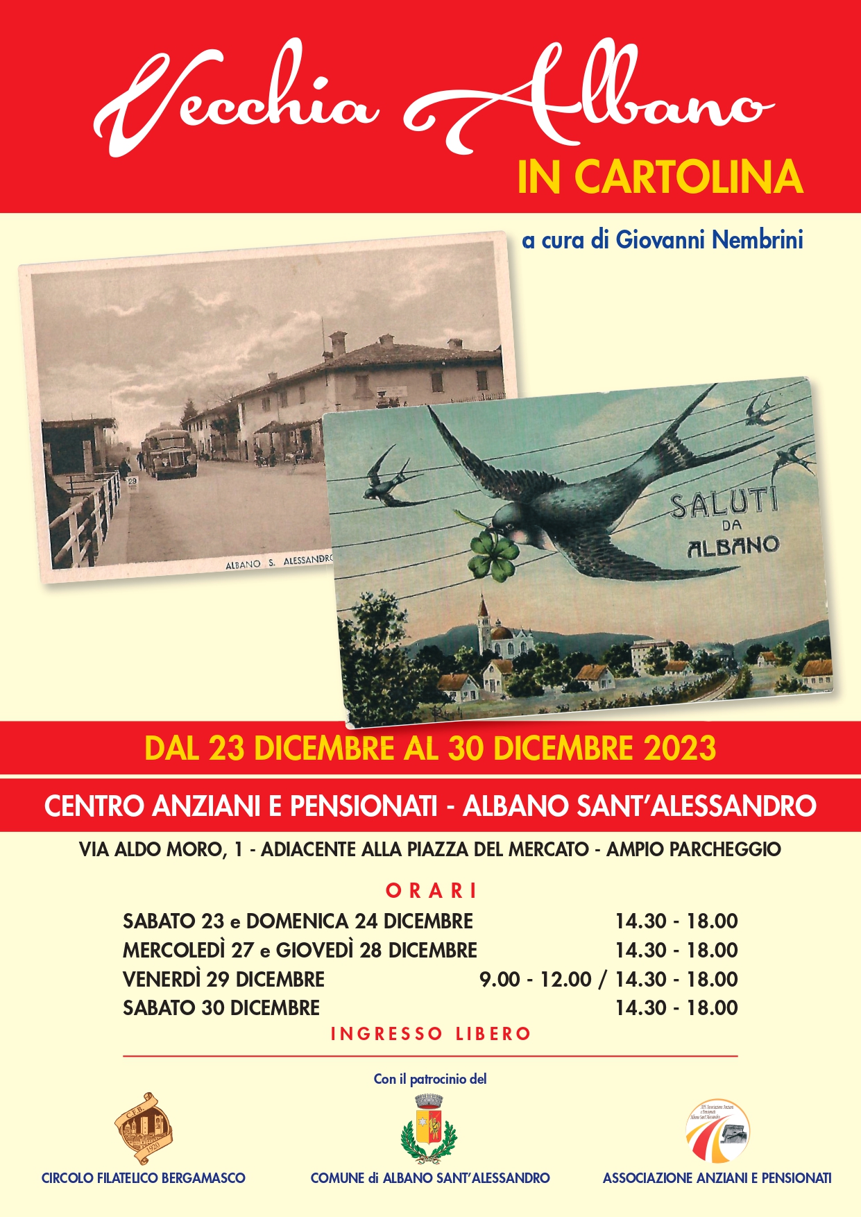La biblioteca di Albano S.Alessandro ha il piacere di invitarvi a visitare l'originale mostra Vecchia Albano in cartolina, che sarà allestita nella sala al primo piano del Centro Anziani e Pensionati di Albano durante il periodo natalizio."Vecchia Albano in cartolina" è una ricca raccolta di cartoline del paese che spaziano dai primissimi anni del Novecento fino agli anni Settanta del secolo. Le cartolinesono state raccolte nel corso del tempo da Giovanni Nembrini con un paziente lavoro di ricerca nei mercatini d'antiquariato e nei circuiti del collezionismo.L'esposizione sarà visitabile negli orari indicati sulla locandina in allegato per tutto il periodo natalizio, da sabato 23 a sabato 30 dicembre, con l'eccezione delle giornate di Natale e Santo Stefano.