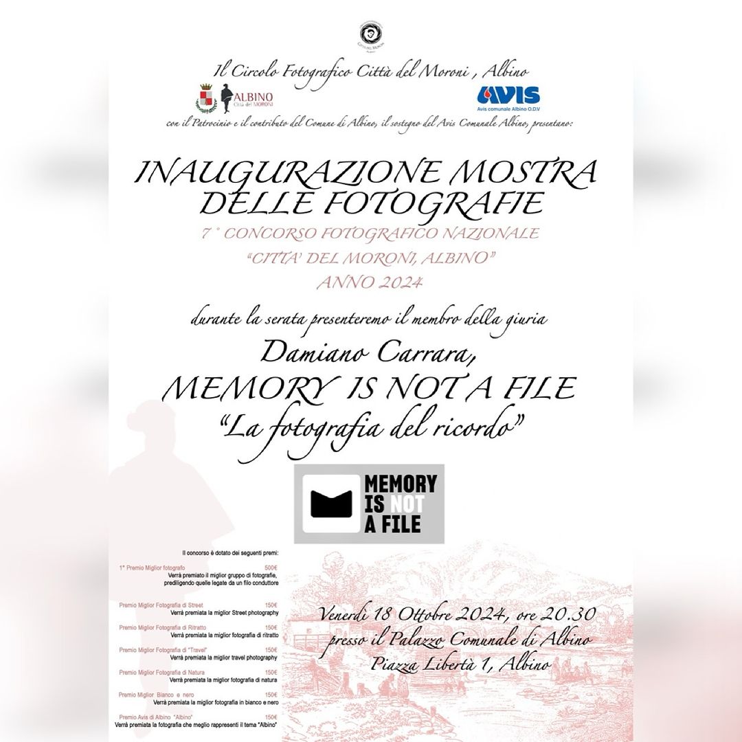 È in programma per venerdì 18 ottobre alle 20.30 presso il Palazzo Comunale di Albino, Piazza Libertà 1, l’inaugurazione della mostra del 7° Concorso Fotografico Nazionale “Città del Moroni, Albino” 2024.Durante la serata verrà presentato il membro della giuria, Damiano Carrara, con l’intervento “Memory is not a file – La fotografia del ricordo” .Premi per le migliori fotografie in diverse categorie!Una serata imperdibile, dedicata alla bellezza e alla potenza evocativa della fotografia.