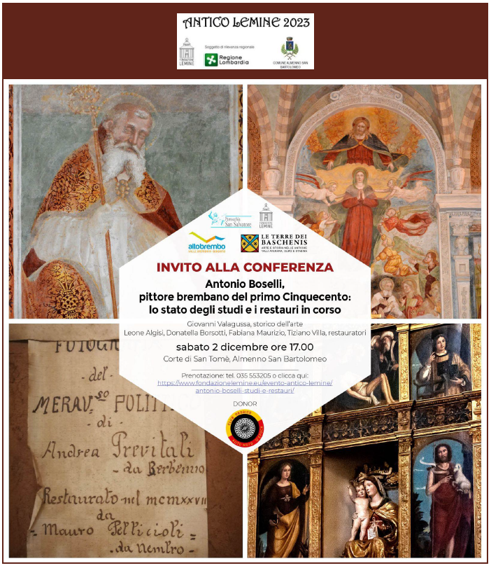 Iniziativa promossa da Le Terre dei Baschenis, Alto Brembo, Parrocchia S. Salvatore, Fondazione Lemine al fine di conoscere gli studi e i restauri del pittore brembano del primo Cinquecento.